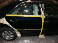 鈑金・塗装1 工程写真はリヤドアへこみ傷の鈑金です。 鉄板の形を整え、微調整でパテを塗り込み 表面を平らにします。 塗装の前段階、サフェーサーを吹きます。 ※サフェーサーとは、塗料を剥れ難くする液です。 |